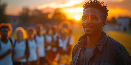 A coach giving a motivational speech to a youth soccer team before a match on a sunny day. Concept Motivational Speech, Youth Soccer Team, Sunny Day, Coaching, Sports Mentoring