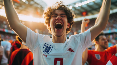 A jubilant soccer fan celebrates a goal, cheering and clapping in a stadium filled with spectators during a crucial match. AIG41