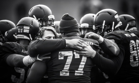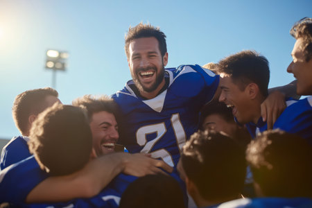 American football players lifting their coach on their shoulders, celebrating victory after match