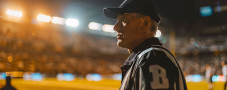 Serious male instructor at team training at an outdoor stadium, portrait of a football coach on the sports field.
