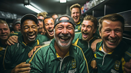Senior football players in the locker room, enjoying their achievement with a cheerful vibe.