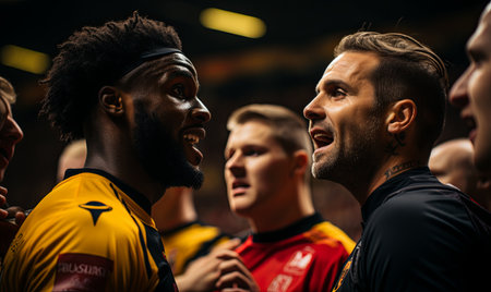 A male of football coach, Inspiring high school football coach delivering a passionate speech, promoting leadership and motivation to a captivated sports team. Generative Ai