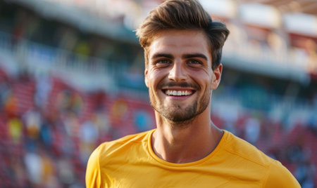Excited man in yellow shirt smiling in front of cheering crowd at soccer game