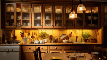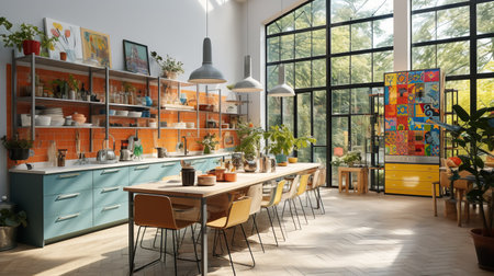 Cozy kitchen with retro decor and colorful utensils in sunlit room. That the image is generated using AI.
