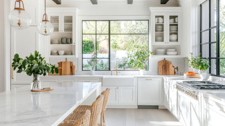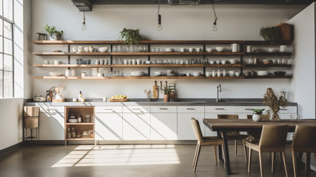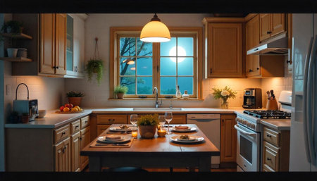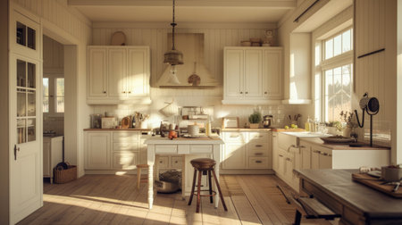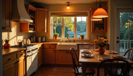 Warm kitchen gathering modern home interior design bright atmosphere wide angle culinary joy