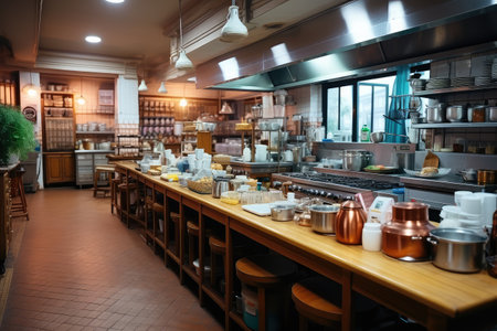 range with view of bustling kitchen, ready for the days cooking, created with generative ai