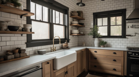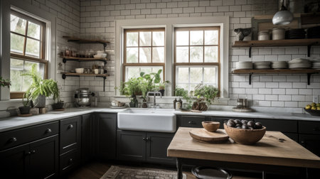 Interior design of Kitchen in Farmhouse style with Farmhouse Sink decorated with Subway Tile, Butcher Block material. Farmhouse architecture. Generative AI AIG24.