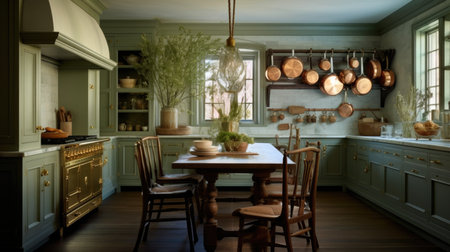 The interior design of gorgeous kitchen with dining table in english style. Generative AI AIG27.