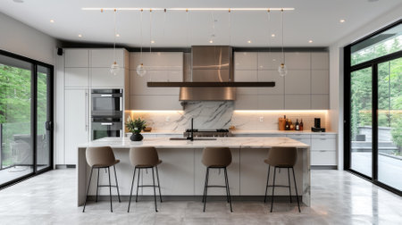 Spacious minimalist kitchen with sleek design, neutral colors, and ample natural light. Resplendent.