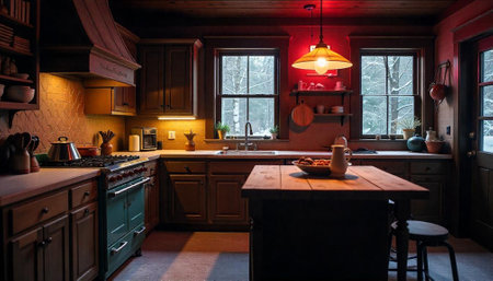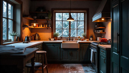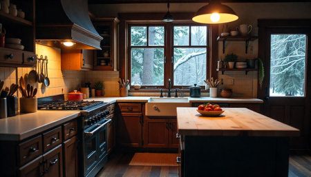 Warm rustic kitchen interior with dark cabinets and snowy view