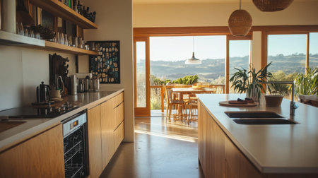 A bright and modern kitchen featuring minimalist design, wooden cabinets, and a scenic view. The warm atmosphere complements the stylish dining area, perfect for relaxation.