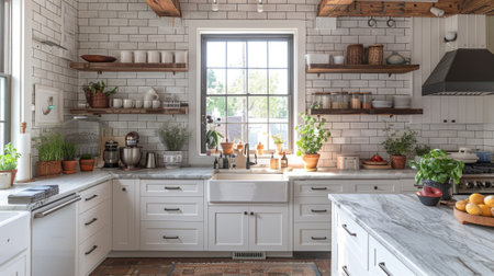 Interior design of Kitchen in Farmhouse style with Farmhouse sink decorated with Ceramic tile, Brick, Shiplap material. Traditional architecture. Generative AI AIG24.