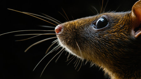 A captivating close-up portrait of a mouse highlights intricate details of its fur, whiskers, and expressive eyes against a dark backdrop.