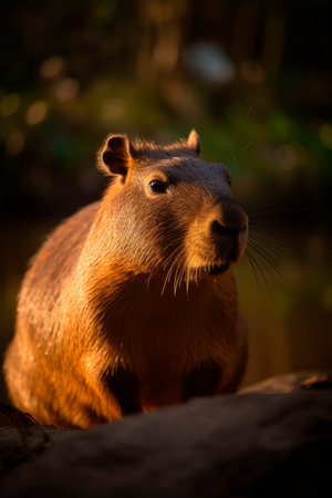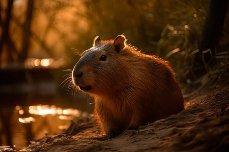 A capybara sitting peacefully by a riverbank during golden hour, soft sunlight filtering through lush green foliage