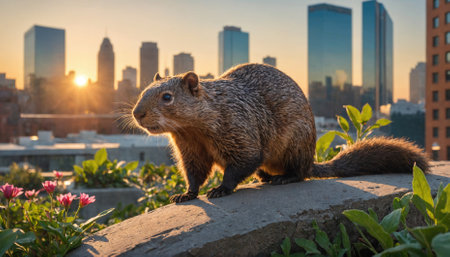 A groundhog sits on a ledge overlooking a city skyline at sunset