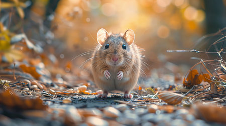In the vibrant canvas of autumn's embrace, a curious mouse emerges amidst a symphony of hushed hues Its tiny silhouette weaves through ancient rocks, carpeted with foliage's fading glory Serene shadows dance across its path, painting a tapestry of tranquility as nature's whispers reverberate through the wilderness This captivating image captures the essence of autumn's artistry and the enduring spirit that thrives within the heart of the forest AI Generative
