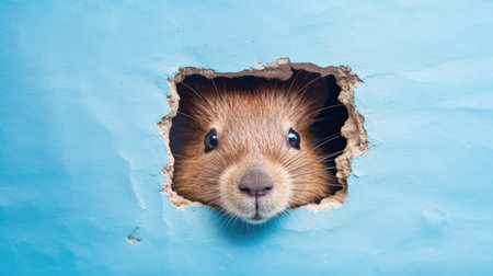 Cute guinea pig peeking through hole in blue paper.