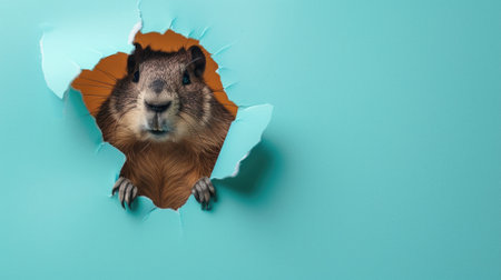 A funny groundhog gazes through a torn hole in a vibrant pastel color paper backdrop, Ai Generated