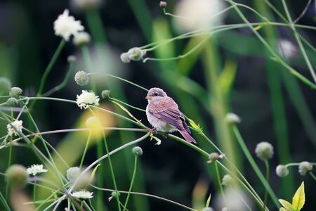 House Sparrow bird (passer domesticus) foraging in a hedge on a colorful sunny day