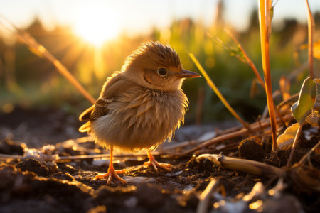 A tiny fledgling sits nestled in its carefully woven home, bathed in the warm, golden glow of the morning sun. It waits patiently, a symbol of new life, hope, and the fragile beauty of a new beginning in the natural world.
