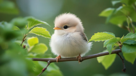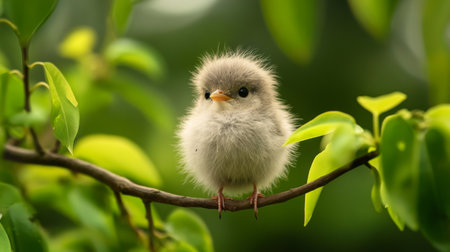 A charming close-up of a fluffy baby bird perched on a branch, surrounded by vibrant green leaves, capturing the innocence and beauty of nature in springtime.