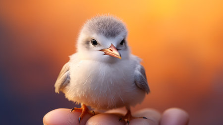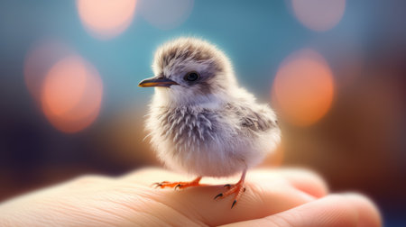 the small bird in this digital art piece sits delicately on a person's hand, evoking a sense of child-like innocence and wonder. the use of vray tracing creates a dreamy, photo-realistic effect, while the light gray and amber color scheme adds to the overall cuteness and charm of the image. the artist's skillful use of cute and colorful techniques makes this piece a standout in