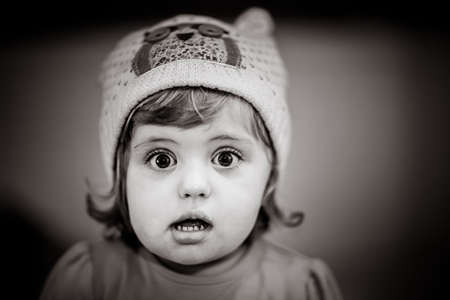 beautiful baby latina, looking up curiously and opening her mouth with a surprised look on her face