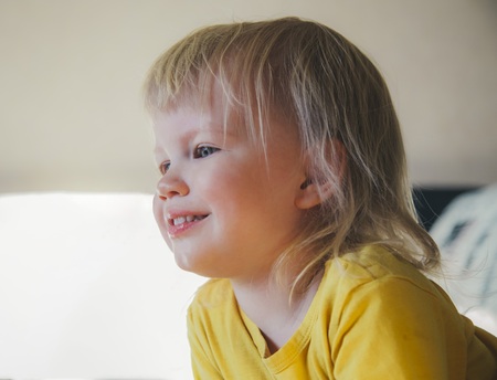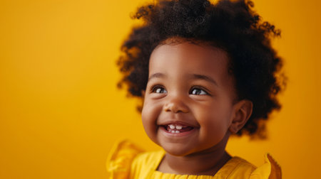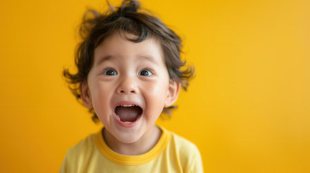 A young child beams with happiness, showcasing pure delight in front of a cheerful yellow backdrop.