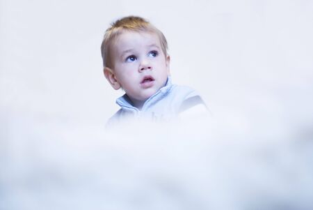 Surprised caucasian child with blue eyes and blonde hair expressing awe.