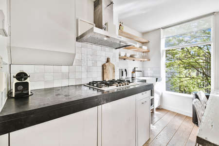 Light small home kitchen with wide window furnished with cupboards and shelves with appliances in modern urban apartment