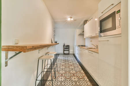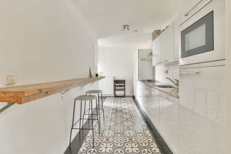 Fragment of interior of light narrow home kitchen with minimalist style white furniture with sink and stove