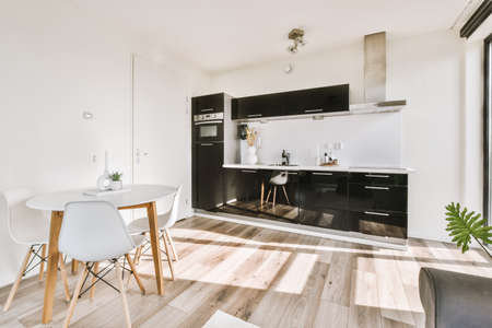 Contemporary minimalist style interior design of light studio apartment with wooden table and chairs in dining zone between open kitchen and living room with white walls and parquet floor