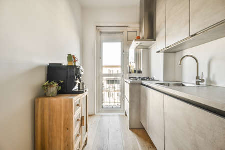 Interior of minimalist style kitchen with simple cupboards and modern appliances in light apartment