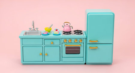 A charming miniature retro kitchen set is displayed against a soft pink background. The set teal-colored cabinets with gold accents, a small oven with a visible rack, a stovetop, a sink with a faucet, and a matching vintage-style refrigerator. On the countertop, a tiny pink teapot, a slice of cake on a plate, and a yellow bowl with a whisk suggest a playful scene of miniature cooking or baking. The overall aesthetic is bright, clean, and whimsical, evoking a sense of nostalgic play.