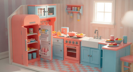 A soft and inviting miniature kitchen is presented in pastel pink and light blue tones. The refrigerator door is open, revealing shelves stocked with miniature food like jars and bottles. The kitchen a retro-style oven, stovetop, sink, and cabinets. Natural light streams in from a window with curtains, creating a warm and cozy atmosphere. The overall impression is one of gentle charm and meticulous detail, imaginative play.
