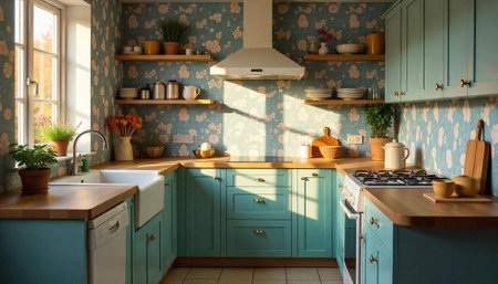 Cozy vintage kitchen with floral wallpaper and warm wooden counters. That the image is generated using AI.