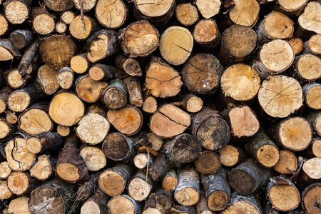 Pile of firewood. Preparation of firewood for the winter. Background. Firewood in the forest. Firewood on camping area fireplace.
