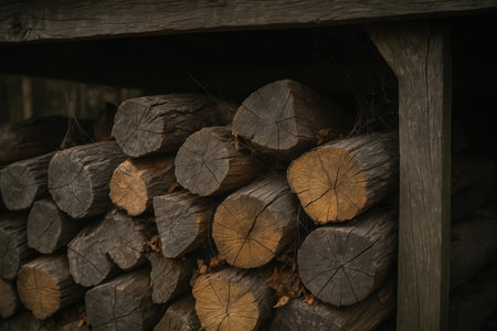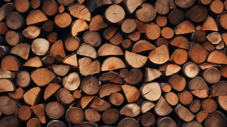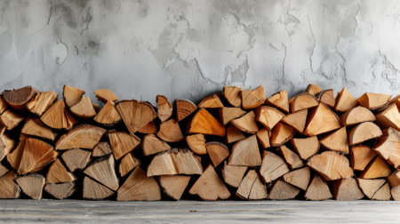 Neatly stacked firewood in rustic setting with natural wood textures and warm tones. Perfect for eco, energy, and rural lifestyle visuals