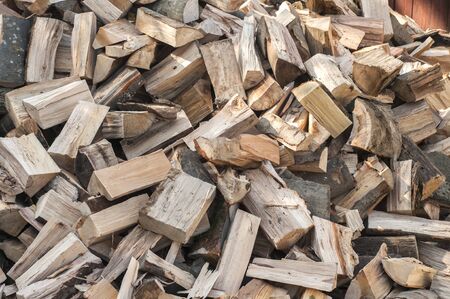 chopped firewood stacked in a woodpile, storage and drying of firewood for home heating