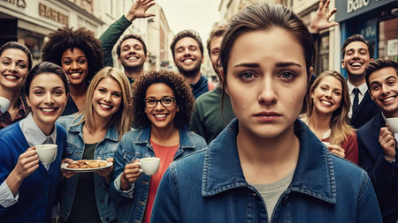 A diverse group of individuals, primarily young adults, surrounds a woman with a somber expression. The image features a shallow depth of field, with the central figure in sharp focus. Warm tones and natural light create a sense of realism. This image is suitable for various commercial uses, including editorial and advertising content.