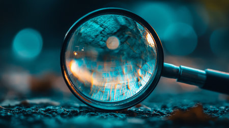 A close-up view of a magnifying glass with a reflective surface, symbolizing investigation, focus, and analysis. Set against a dark, moody background.