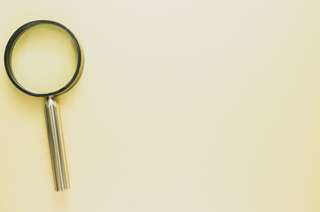 Magnifying glass on yellow background. View from above with copy space