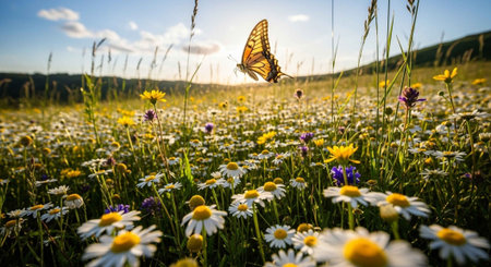 Generative AI : Flowers daisies in grass and butterfly in meadow in nature in rays of sunlight in summer or spring closeup macro Picturesque colorful artistic image with a soft foc