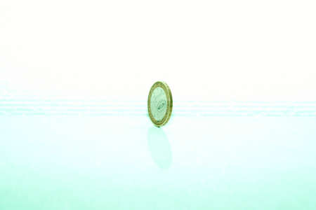 Japanese ten yen coins on both sides stand on a white background. Fragments of close-ups. not isolated. Picture with high contrast, sharpness and saturation. Shot with a macro lens