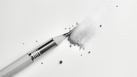 A detailed close-up of a sharpened pencil tip resting on a shimmering pile of graphite dust. This macro shot highlights the texture and materials, perfect for art and design themes.