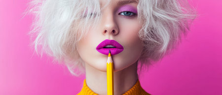 A striking model stands against a bright pink backdrop, holding a yellow pencil to her lips. She displays dramatic makeup with vivid colors and a chic hairstyle.