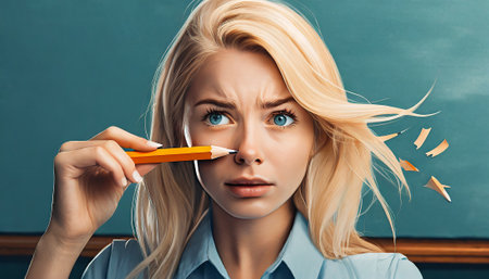 frustrated young woman holding pencil and looking at camera in classroom