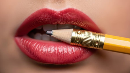 A woman's full, glossy red lips gently bite down on a yellow pencil, creating a suggestive and artistic composition