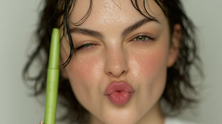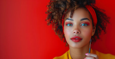 Young woman holding lip balm near lips with vivid background and bright makeup