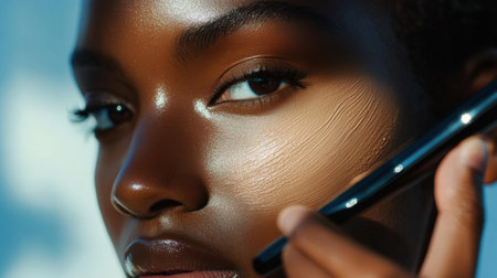 A makeup artist's hand applying foundation to a model's face, with the focus on the smooth blending of the product, highlighting professional technique.